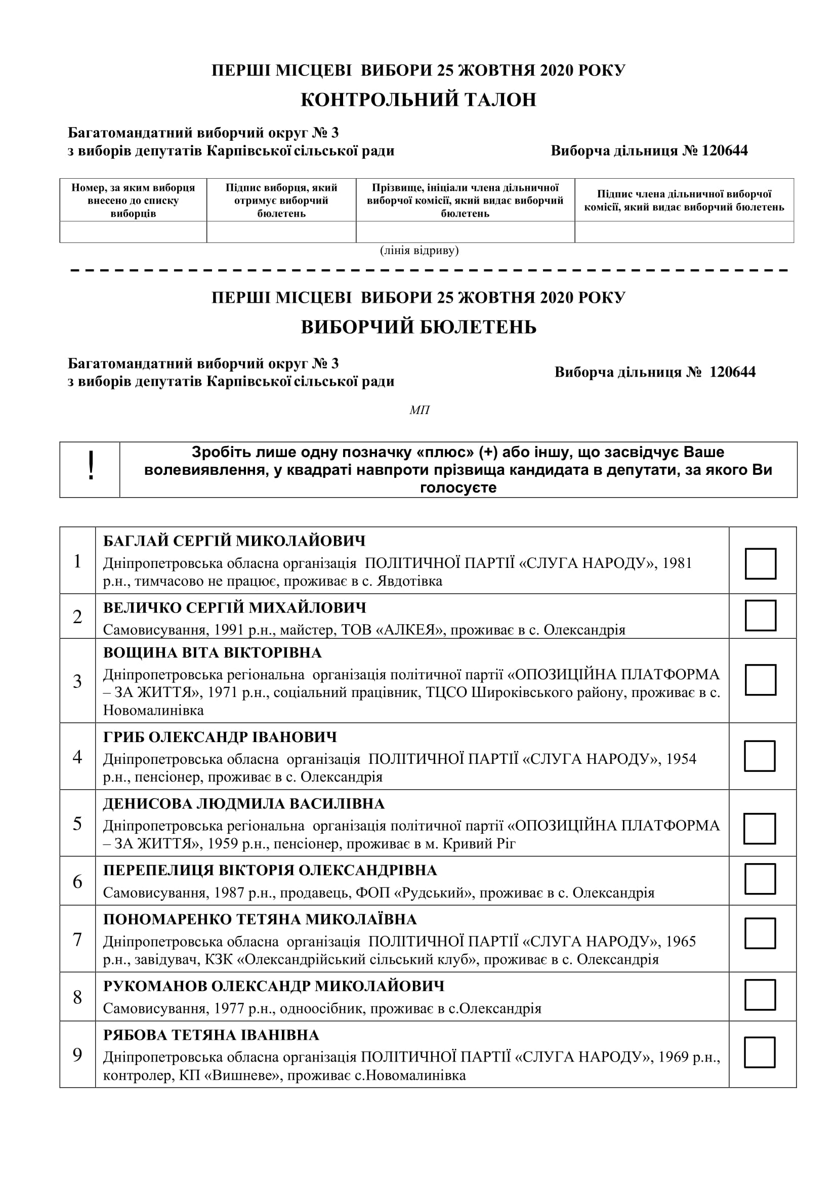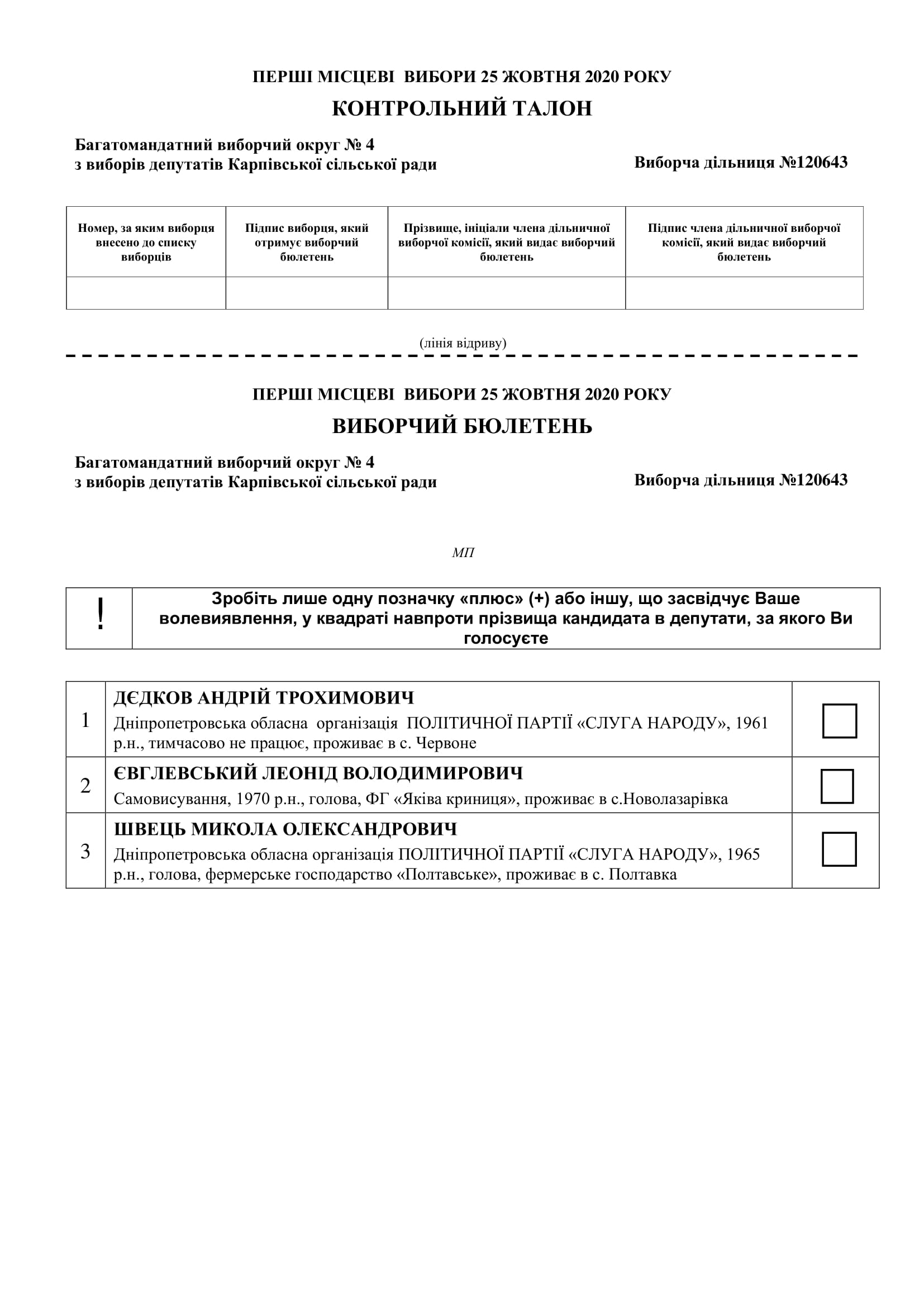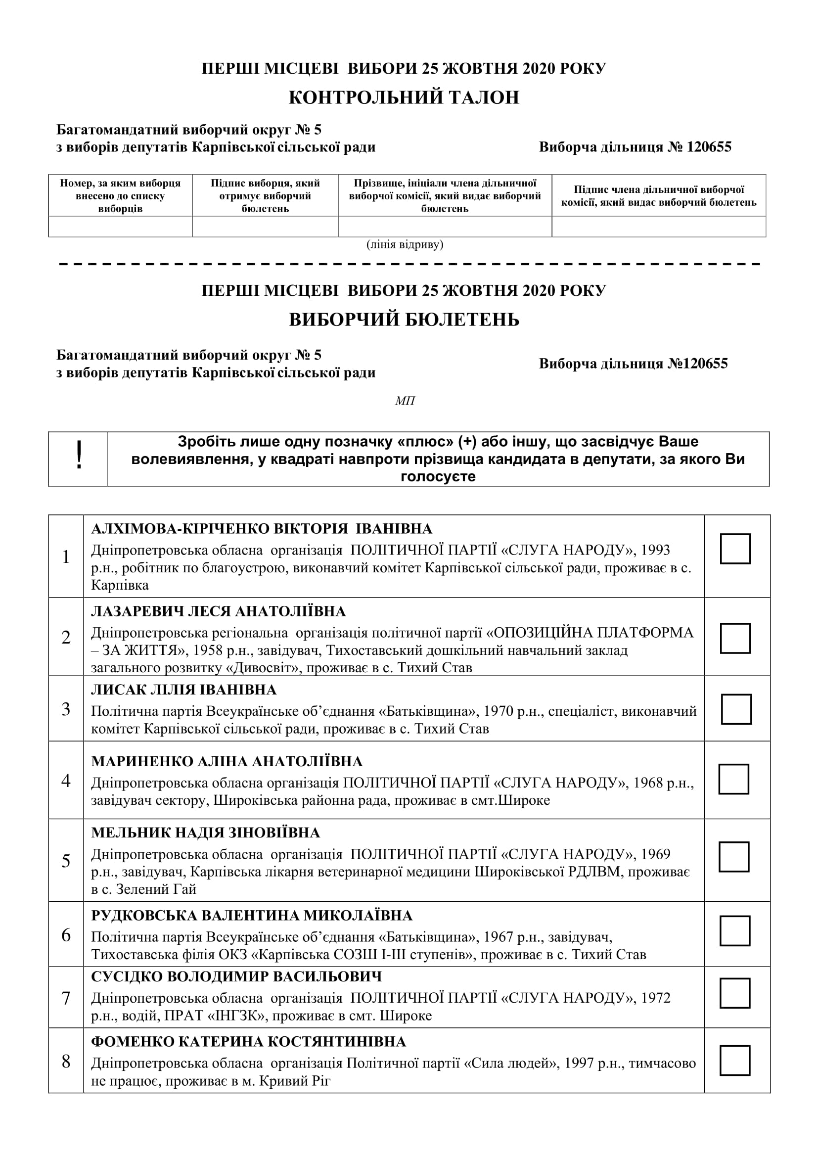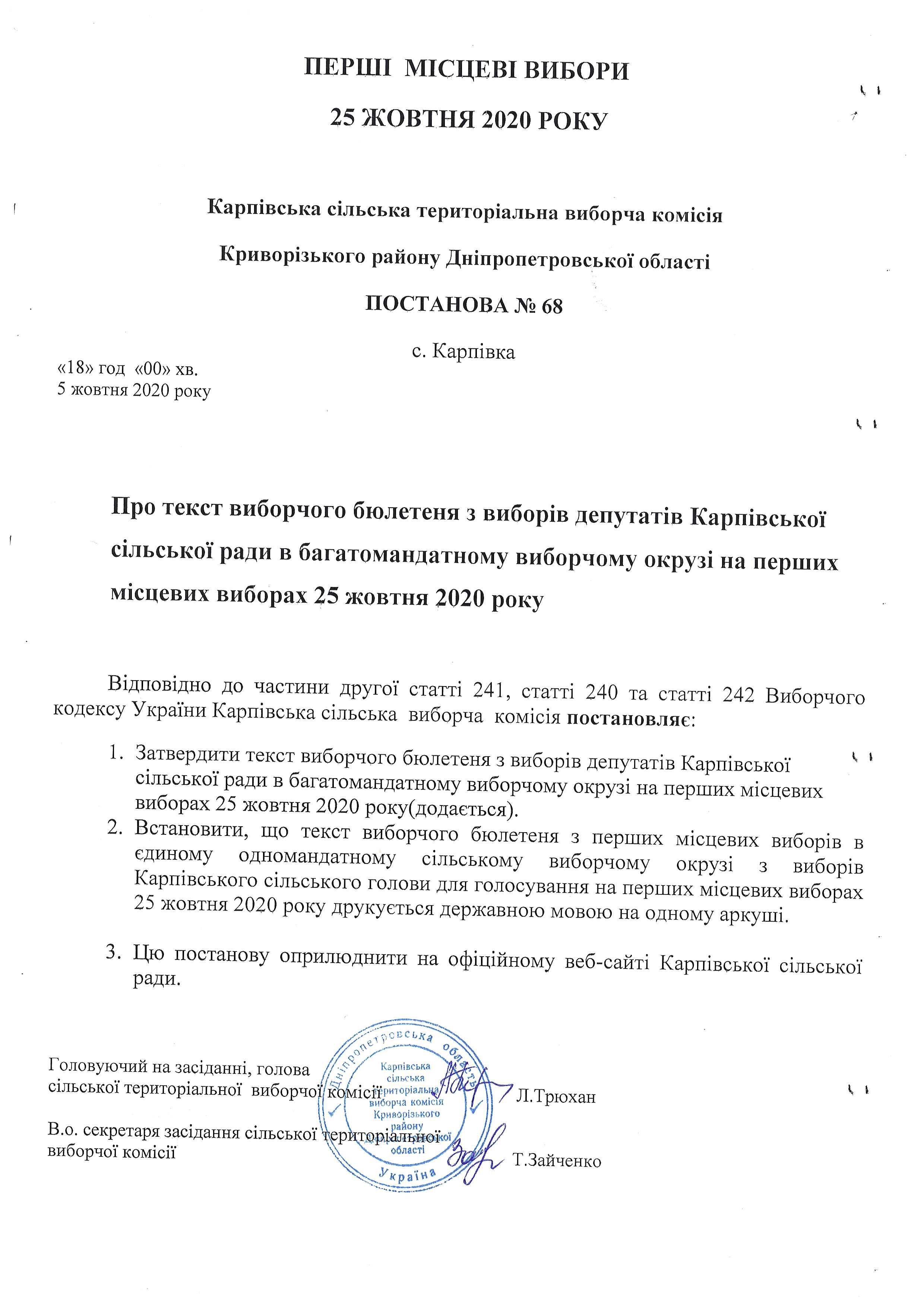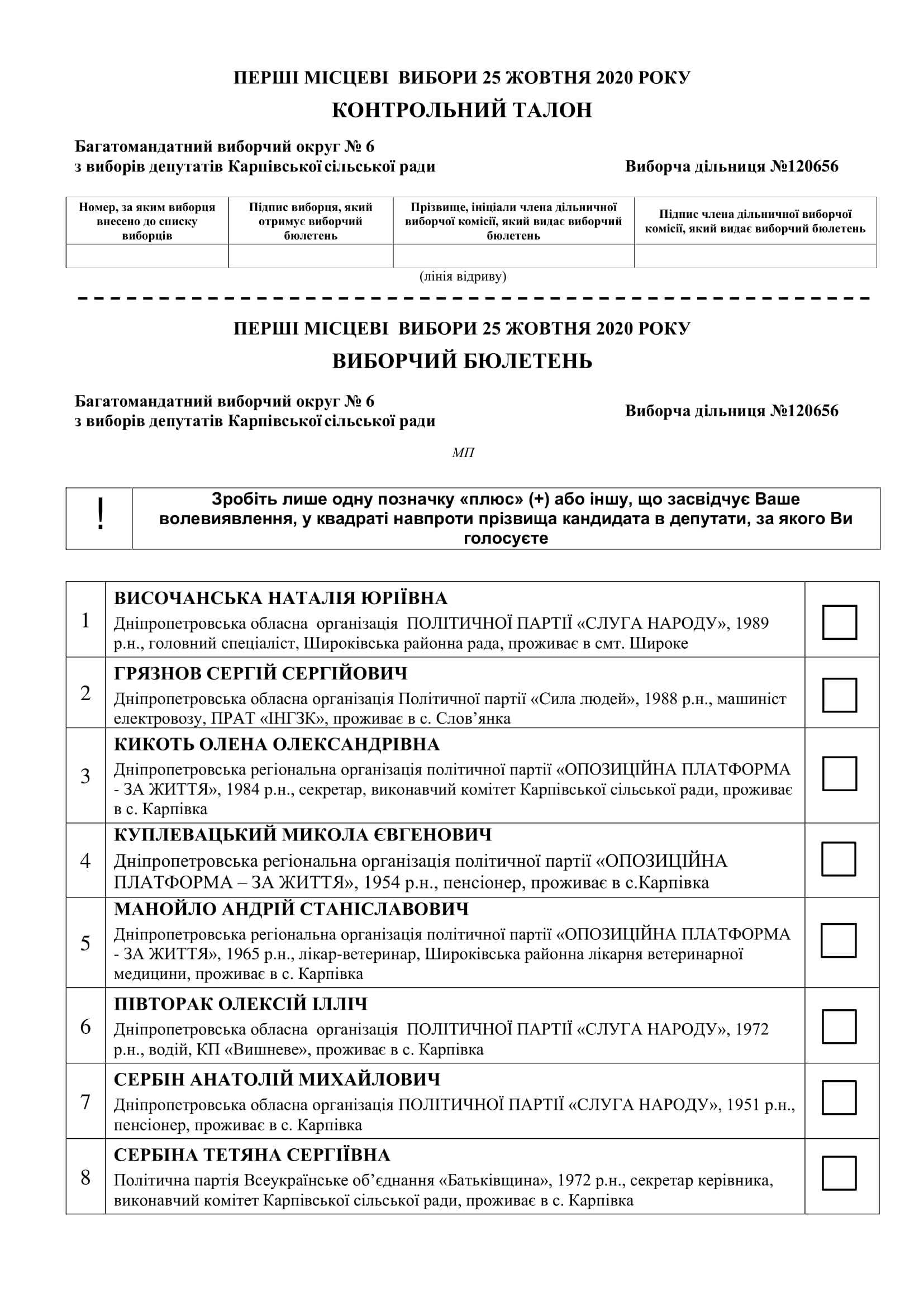 Затверджений текст виборчого бюлетeня з виборів депутатів Карпівської сільської ради в багатомандатному виборчому окрузі - 2020 р.